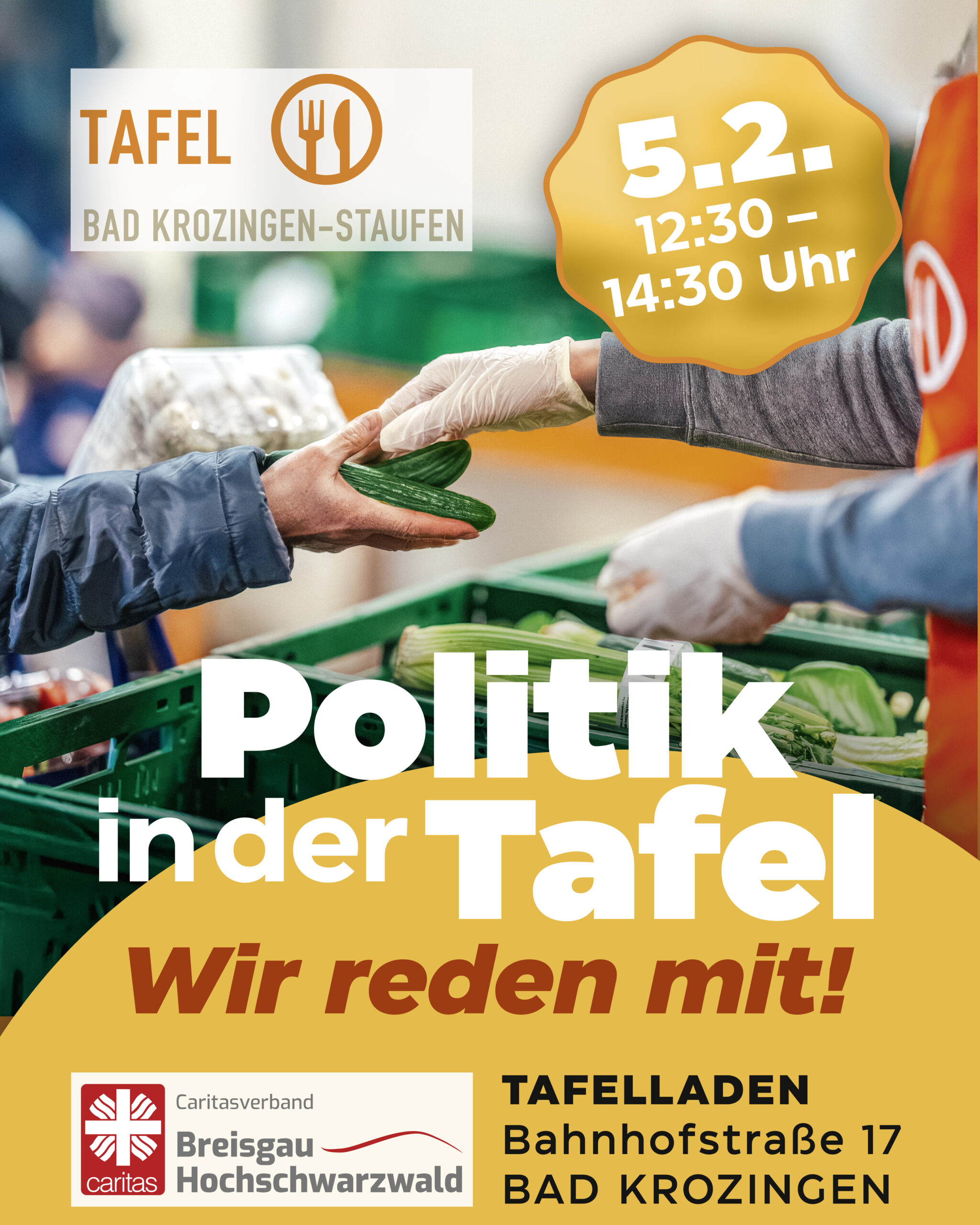 In gemütlicher Atmosphäre bei kostenlosem Essen und Getränken erhalten alle Besucher:innen die Gelegenheit, ihre Fragen zu stellen und Anliegen zu äußern, die sie im Alltag bewegen. Im Fokus stehen dabei zentrale Themen wie bezahlbarer Wohnraum, Arbeitsbedingungen, der öffentliche Nahverkehr sowie die Bekämpfung von Armut, Diskriminierung und Ausgrenzung. Die Veranstaltung versteht sich als Einladung zur Begegnung auf Augenhöhe, um sicherzustellen, dass die Stimmen der Menschen vor Ort gehört werden. Der Caritasverband Breisgau-Hochschwarzwald und das Team der Tafel Bad Krozingen-Staufen freuen sich auf einen regen Austausch und viele Teilnehmer:innen.